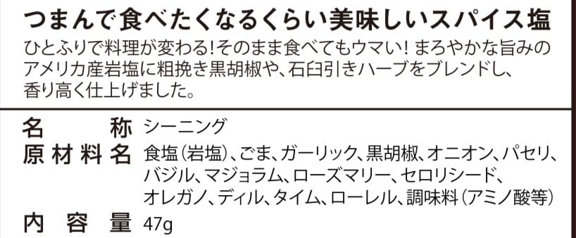 主成分はアメリカ産岩塩、さらに厳選したブラックペッパーやハーブを使用。安心してご利用いただける製品です。
